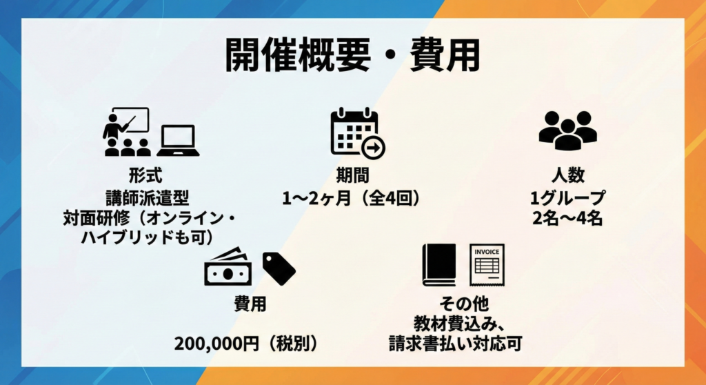 - 1回3時間 × 全4回(総訓練12時間)/1〜2ヶ月